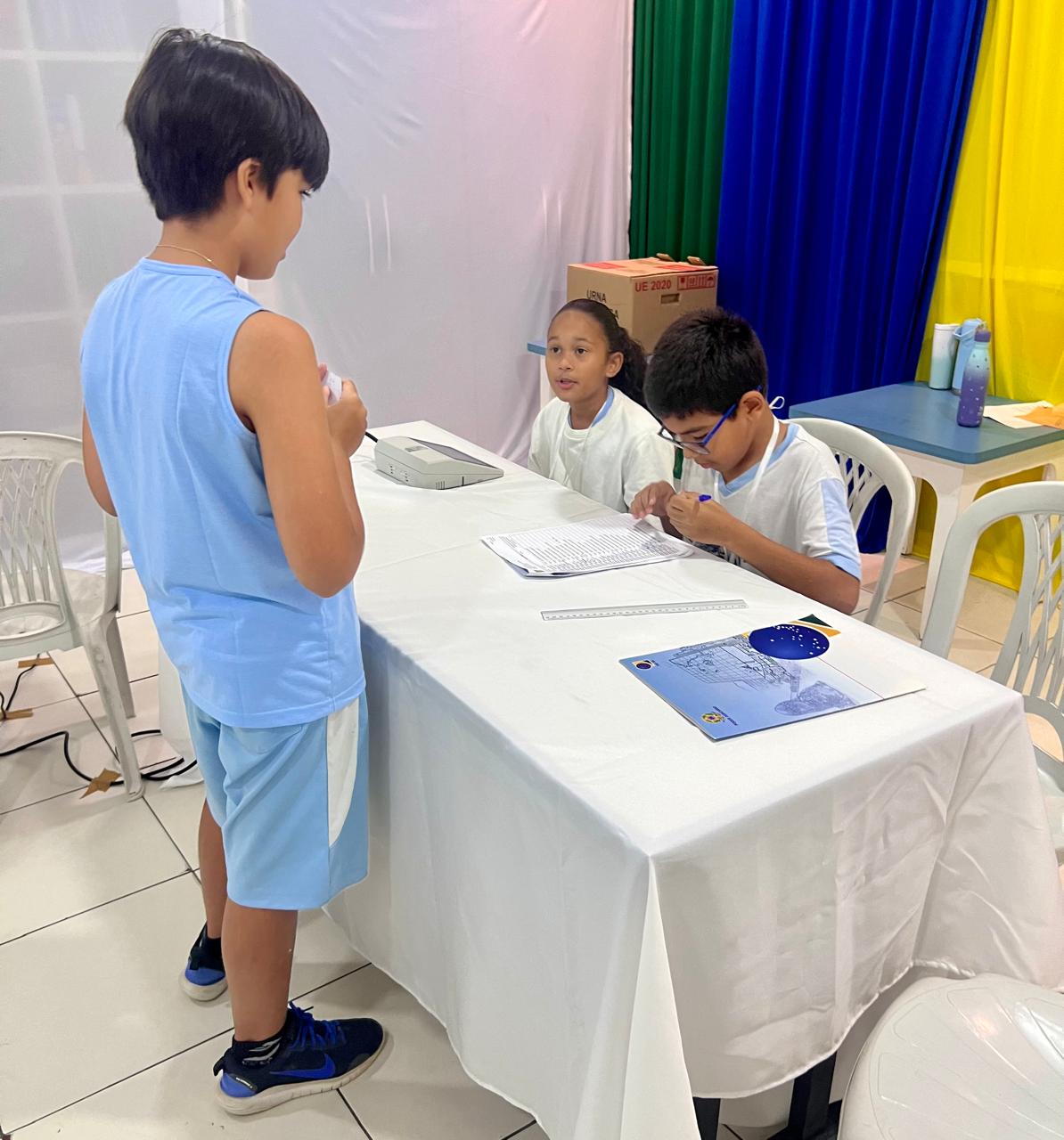 Durante a programação, os estudantes assumiram diferentes funções, atuando como eleitores e mesários, em uma experiência educativa sobre o funcionamento das eleições e o papel do cidadão na sociedade.